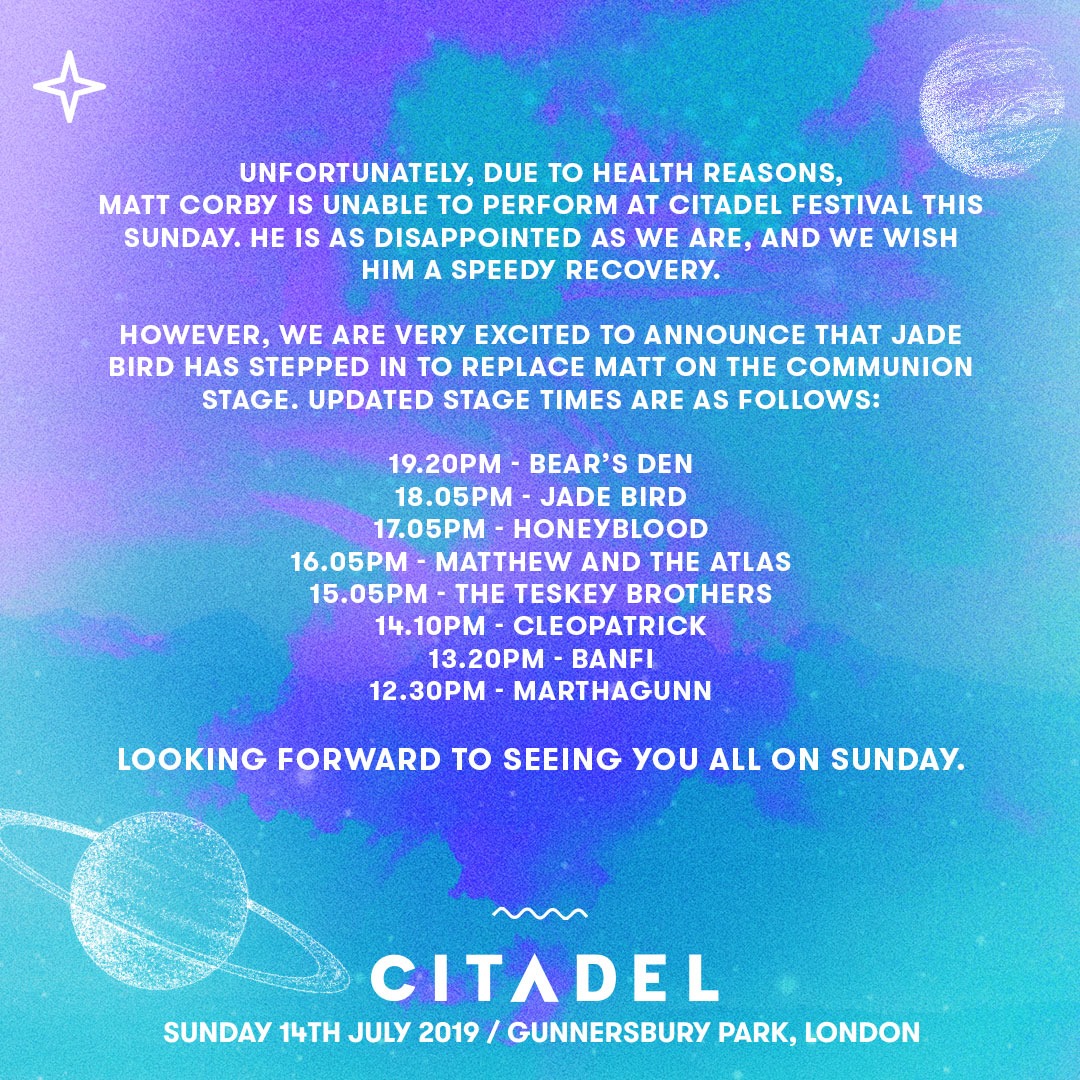 Unfortunately, due to health reasons, Matt Corby is unable to perform at Citadel Festival this Sunday. He is as disappointed as we are, and we wish him a speedy recovery.