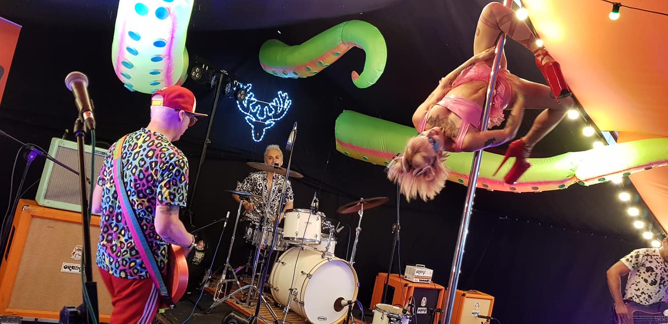 Its thraipsing it down with precipitation now but the shenanigans continue. Hip hop afrobeat kingsters Franz Von on the main with The Achievers a great Roots, Blues, old timey act following. On the Roy Stone an incredible act with a pole and pink bikini type thing going by the name of Tokyo Taboo and Maritime folk funsters, Seas Of Mirth back on the main. Some guy with long legs was trying to catch small children in his butterfly net earlier. All good stuff from the heart of rural Nottinghamshire….. In the rain.
