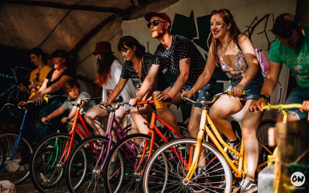 This stage is 100% renewable-powered with solar-battery powered lighting and decks. The sound system is fully powered by 8 bike generators with highly efficient kit from Reaction Bike-powered Sound System; creating an impressive amount of sound. You have to see it to believe it!
