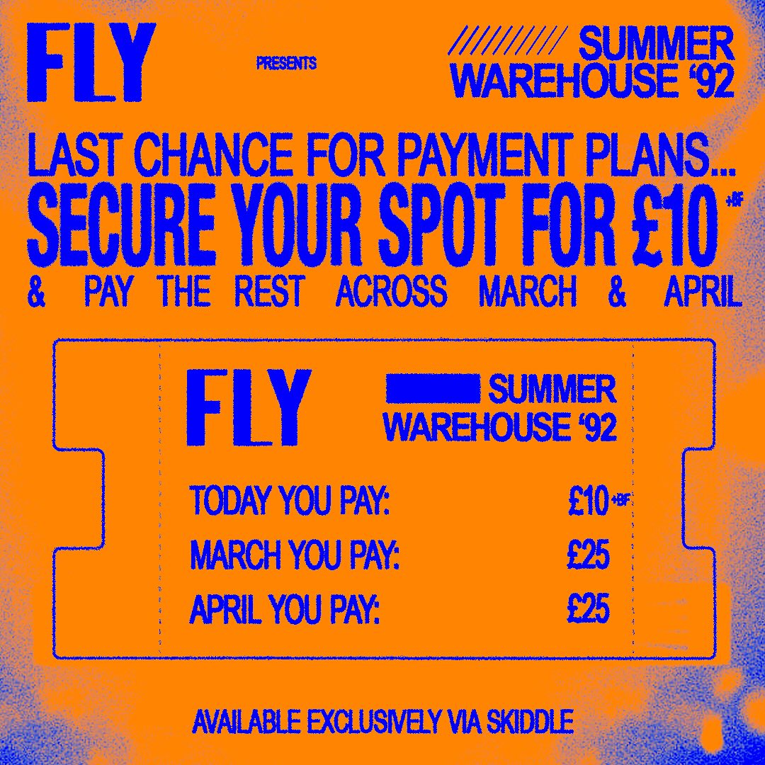 This is your final warning 🚨 You have until tomorrow to secure your FLY Warehouse 92 ticket via payment plan – pay £10+bf today, & split the cost across March & April. Tag your friends, spread the word. Don’t miss out! Tickets available via @skiddleuk 🤝