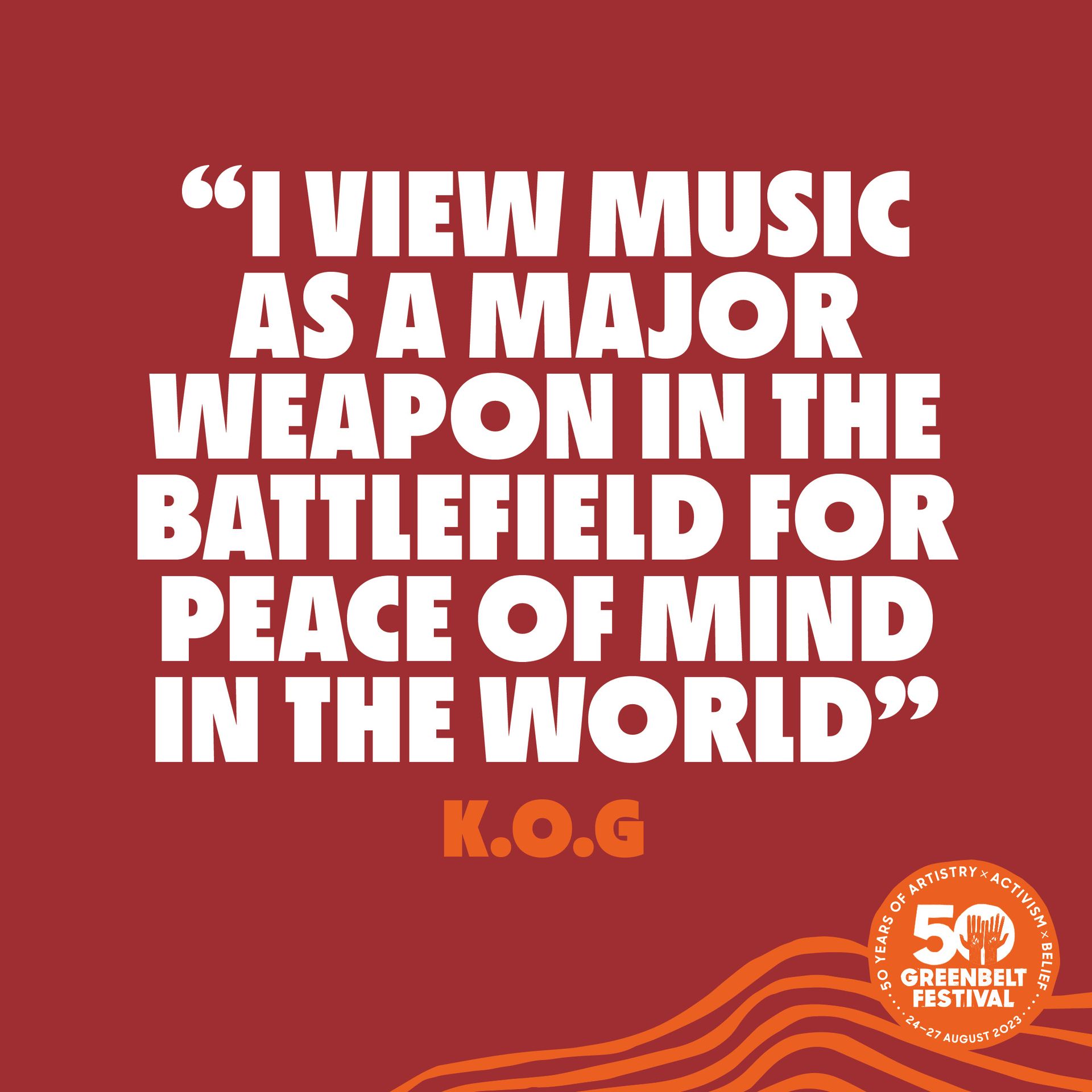 “I view MUSIC as a major WEAPON in the BATTLEFIELD for PEACE of MIND in the world.” – K.O.G 50 years of creativity as resistance. See K.O.G at Greenbelt Festival 2023. https://www.greenbelt.org.uk/buy-tickets/ #GB50 #GreenbeltFestival #Artistry #Activism #Belief