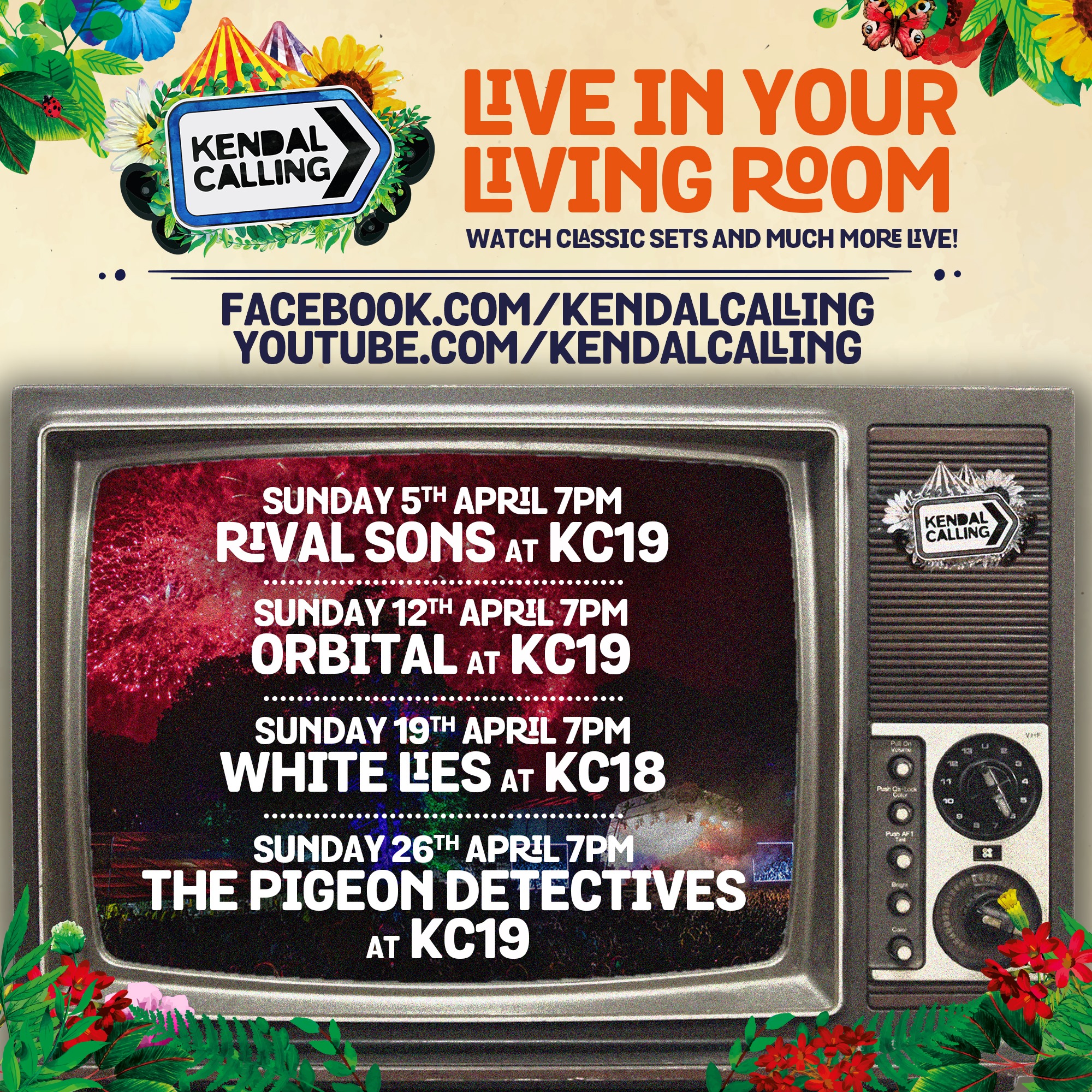Kendal Calling Live In Your Living Room 📺 Our schedule for April is here, featuring RIVAL SONS, Orbital, White Lies and The Pigeon Detectives! Tune in on Facebook or YouTube. Find out more at kendalcalling.co.uk/live-in-your-living-room