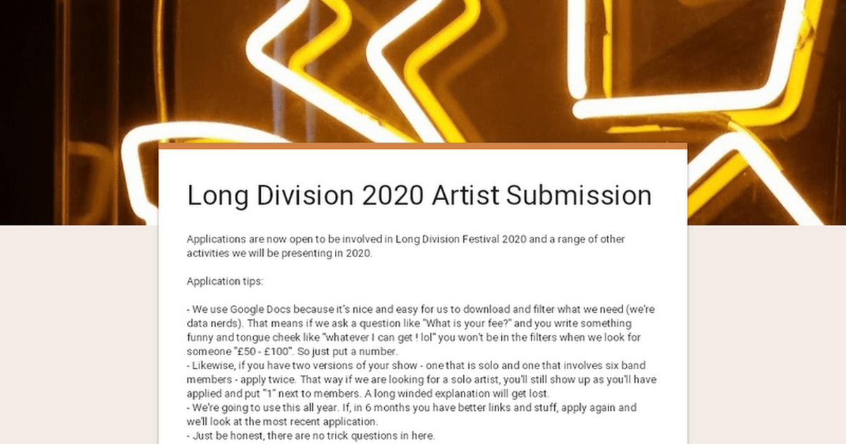 Applications are now open to be involved in Long Division Festival 2020 and a range of other activities we will be presenting in 2020. Application tips: – We use Google Docs because it's nice and easy for us to download and filter what we need (we're data nerds). That means if we ask a question like…